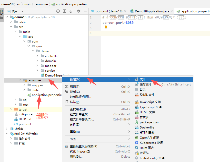 在spring boot中,properties这种文件用的少,所以直接删除,然后创建新的配置文件