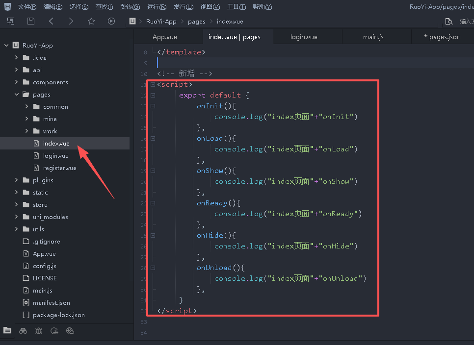 我们在index.vue中新增代码,测试一下页面的生命周期。